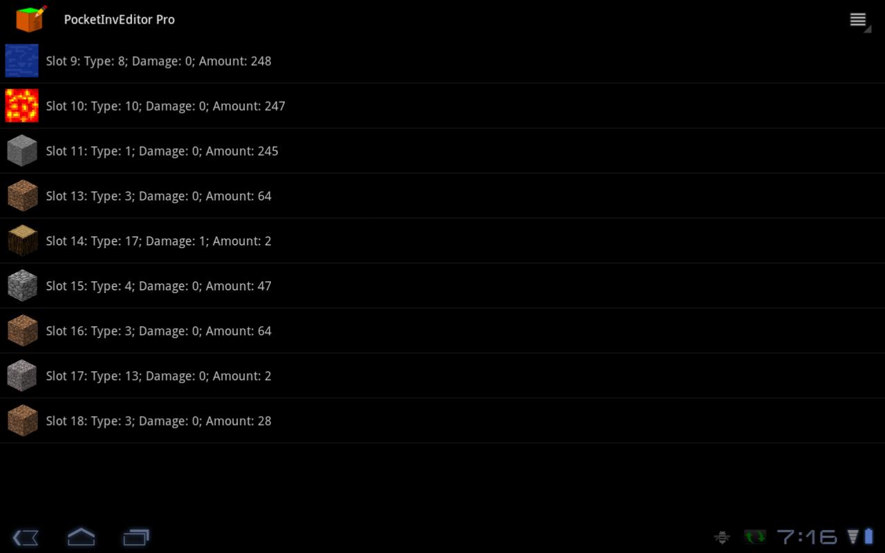 PocketInvEditor Pro is an inventory editor for Minecraft Pocket Edition. With this tool, you can give yourself more blocks and items without writing a single hexadecimal digit or connecting to a computer.